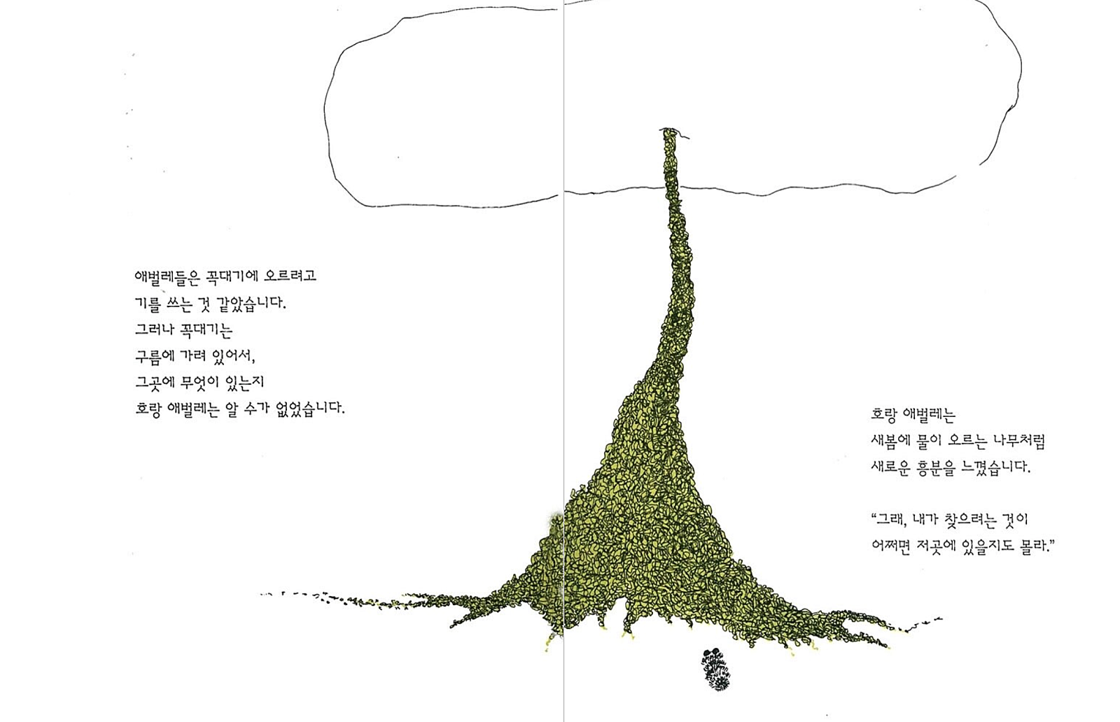 “삶이 단지 먹고 자라는 것뿐일까?” 이 질문은 그를 새로운 세상으로 이끈다. 여행을 떠난 줄무늬 애벌레는 수많은 애벌레들이 꼭대기를 향해 기어오르는 거대한 ‘애벌레 더미’를 목격한다. 누구도 왜 올라가는지 알지 못하지만, 모두가 ‘저 위에는 분명 무언가가 있을 것’이라는 막연한 믿음으로 경쟁한다.